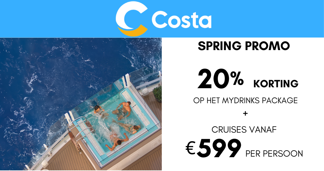 Profiteer nu van een all inclusive vakantie bij Costa Cruises voor de meest scherpe tarieven en 20% korting op het MyDrinks pakket