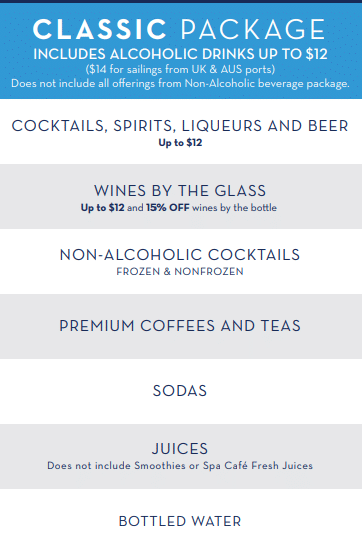 Bij Celebrity Cruises kunt u uw cruise uitbreiden met het Always Included-pakket. Dit pakket omvat Surf Wi-Fi en het Classic Drankpakket. Binnen het Classic Drankpakket zijn alle alcoholische en non-alcoholische dranken tot $12,- per glas inbegrepen. Met Surf Wi-Fi kunt u gebruikmaken van WhatsApp en uw e-mail controleren; het streamen en het verzenden van foto’s en video’s is hierbij niet inbegrepen.