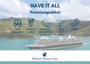 Voor reizigers die het op prijs stellen om een inclusieve vakantie te hebben met extra’s die vooraf in de prijs zijn verwerkt, heeft Holland America Line het ‘HAVE IT ALL’ premiumpakket gelanceerd. In het pakket zijn excursie(s), drankenpakket, diner(s) in specialiteitenrestaurants en Wi-Fi inbegrepen. Dit pakket (niet te verwarren met onze eerdere Have It All promotie) is het gehele jaar door beschikbaar op alle cruises van 6 nachten of langer met uitzondering van onze Grand Voyages.