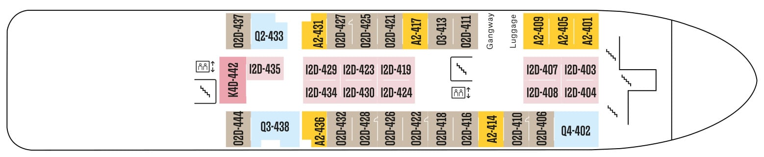 Deze comfortabele buitenhutten voor maximaal drie personen op het middendek hebben aparte bedden en badkamers met douche / toilet. De hutten hebben beperkt of geen uitzicht.