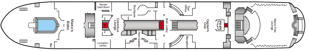 Er zijn vijf grote lounges. Het Magellan Deck biedt de Marco Polo Lounge in theaterstijl, terwijl de elegante Captain’s Club een perfecte locatie is voor cocktails voor het diner met de vaste pianist.